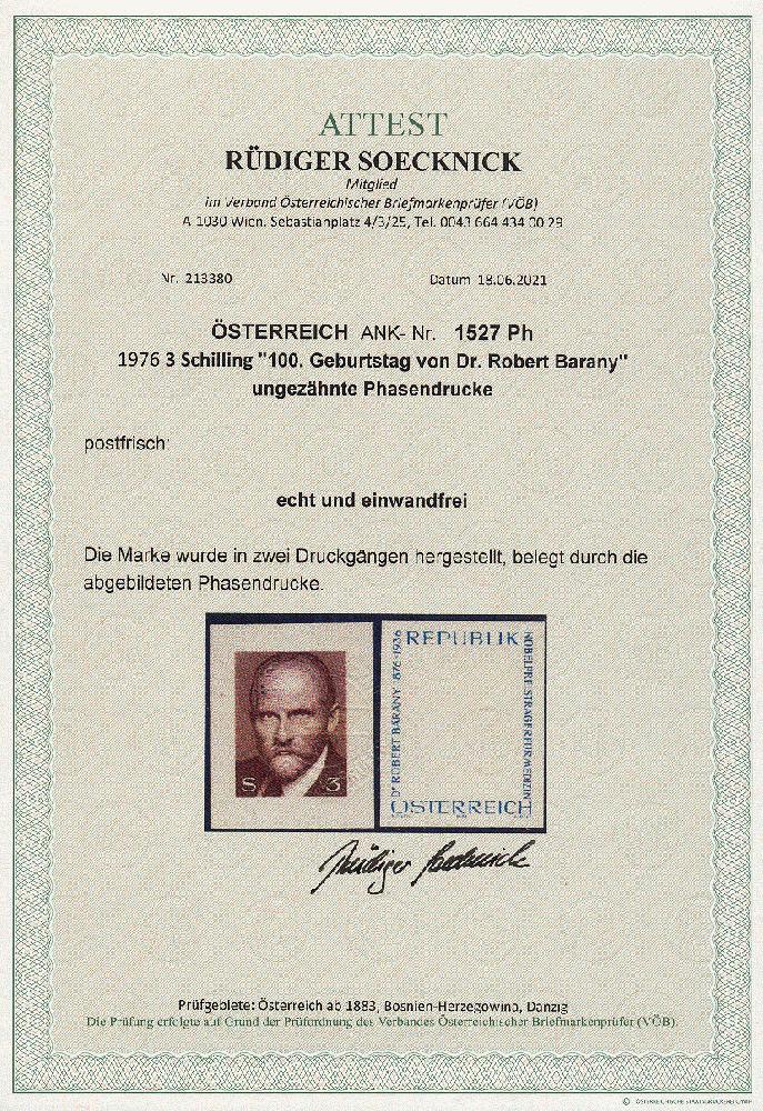 | Zusatzinformationen und Suchstichworte: | 11. Auktion Stilus Auktionstermin: 5. Juni 2022 Los 73 Österreich 2. Republik Österreich, 1976, ANK-Nr.: 1527 Ph U (Michel-Nr.: 1509), '100. Geburtstag von Dr. Robert Bàràny', 3 Schilling, ungezähnte Phasendrucke (2), postfrisch **, einwandfreie Erhaltung, Attest Soecknick VÖB Ausruf 100,00 EUR |