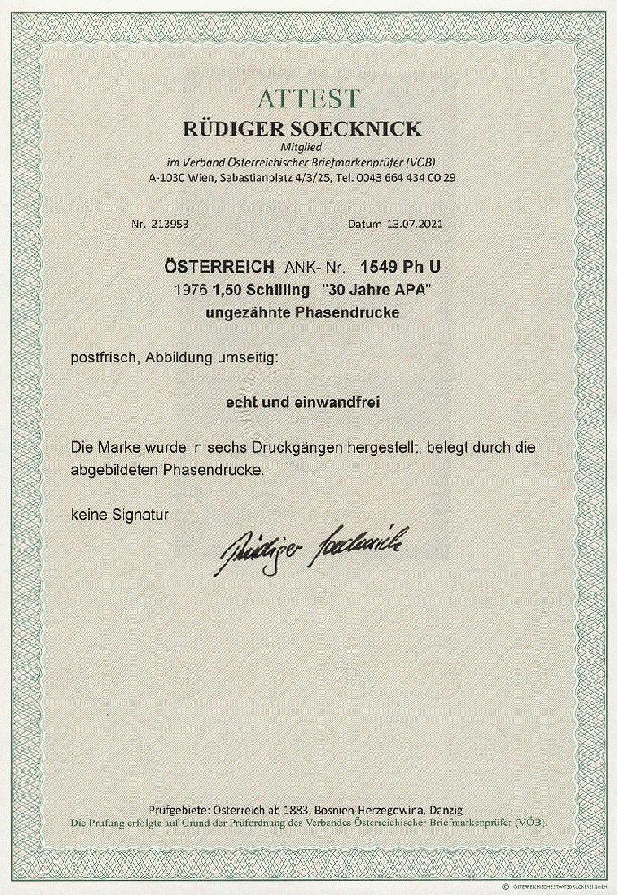 | Zusatzinformationen und Suchstichworte: | 11. Auktion Stilus Auktionstermin: 5. Juni 2022 Los 78 Österreich 2. Republik Österreich, 1976, ANK-Nr.: 1549 Ph U (Michel-Nr.: 1533), '30 Jahre Austria Presseagentur (APA)', 1,5 Schilling, ungezähnte Phasendrucke (6), postfrisch **, einwandfreie Erhaltung, Attest Soecknick VÖB Ausruf 100,00 EUR |