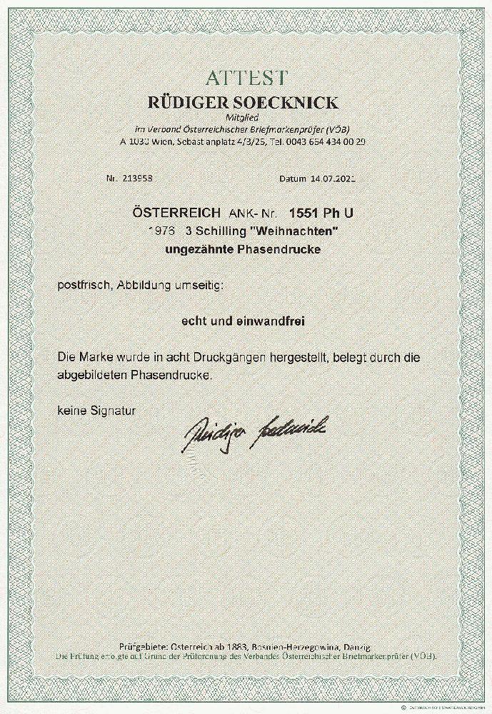 | Zusatzinformationen und Suchstichworte: | 11. Auktion Stilus Auktionstermin: 5. Juni 2022 Los 79 Österreich 2. Republik Österreich, 1976, ANK-Nr.: 1551 Ph U (Michel-Nr.: 1535), 'Weihnachten 1976', 3 Schilling, ungezähnte Phasendrucke (8), postfrisch **, einwandfreie Erhaltung, Attest Soecknick VÖB Zuschlag 110,00 EUR |