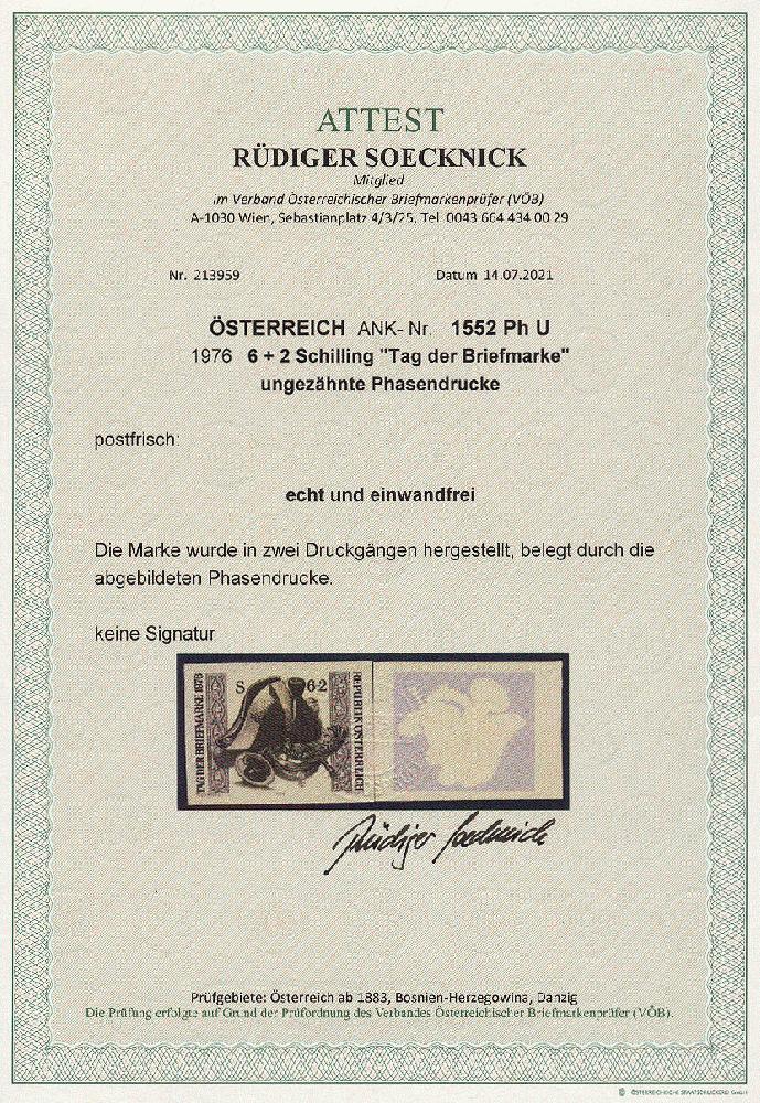 | Zusatzinformationen und Suchstichworte: | 11. Auktion Stilus Auktionstermin: 5. Juni 2022 Los 80 Österreich 2. Republik Österreich, 1976, ANK-Nr.: 1552 Ph U (Michel-Nr.: 1536), 'Tag der Briefmarke 1976', 6 + 2 Schilling, ungezähnte Phasendrucke (2), postfrisch **, einwandfreie Erhaltung, Attest Soecknick VÖB Zuschlag 100,00 EUR |