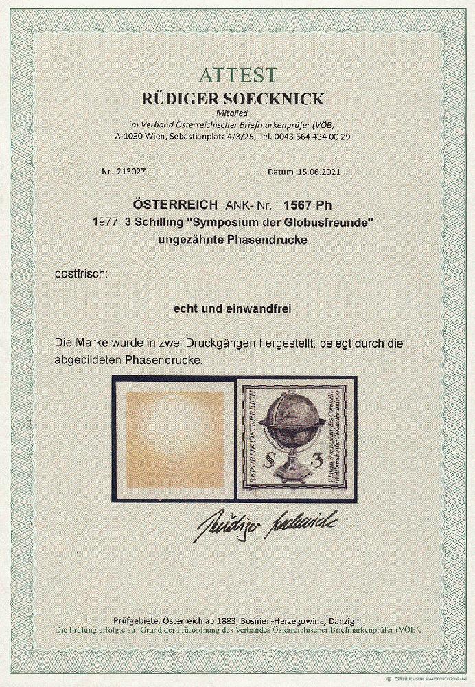 | Zusatzinformationen und Suchstichworte: | 11. Auktion Stilus Auktionstermin: 5. Juni 2022 Los 83 Österreich 2. Republik Österreich, 1977, ANK-Nr.: 1567 Ph U (Michel-Nr.: 1554), 'V. Intern. Symposium des Coronelli-Weltbundes der Globusfreunde', 3 Schilling, ungezähnte Phasendrucke (2), postfrisch **, einwandfreie Erhaltung, Attest Soecknick VÖB Ausruf 100,00 EUR |