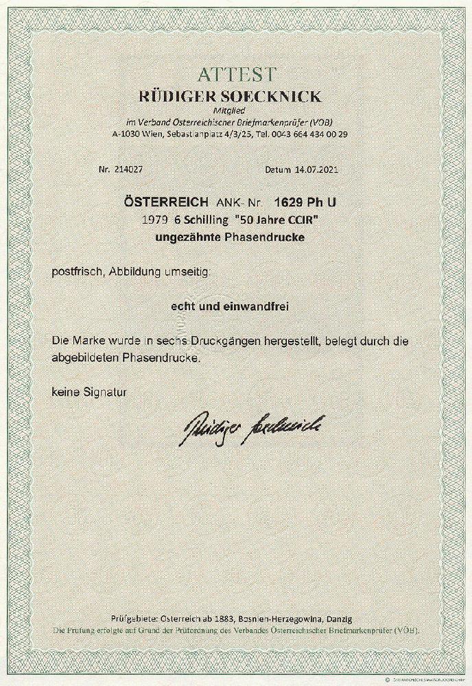 | Zusatzinformationen und Suchstichworte: | 11. Auktion Stilus Auktionstermin: 5. Juni 2022 Los 98 Österreich 2. Republik Österreich, 1979, ANK-Nr.: 1629 Ph U (Michel-Nr.: 1598), '50 Jahre Internationaler Beratender Ausschuss für den Funkdienst (CCIR)', 6 Schilling, ungezähnte Phasendrucke (6), postfrisch **, einwandfreie Erhaltung, Attest Soecknick VÖB Ausruf 100,00 EUR |