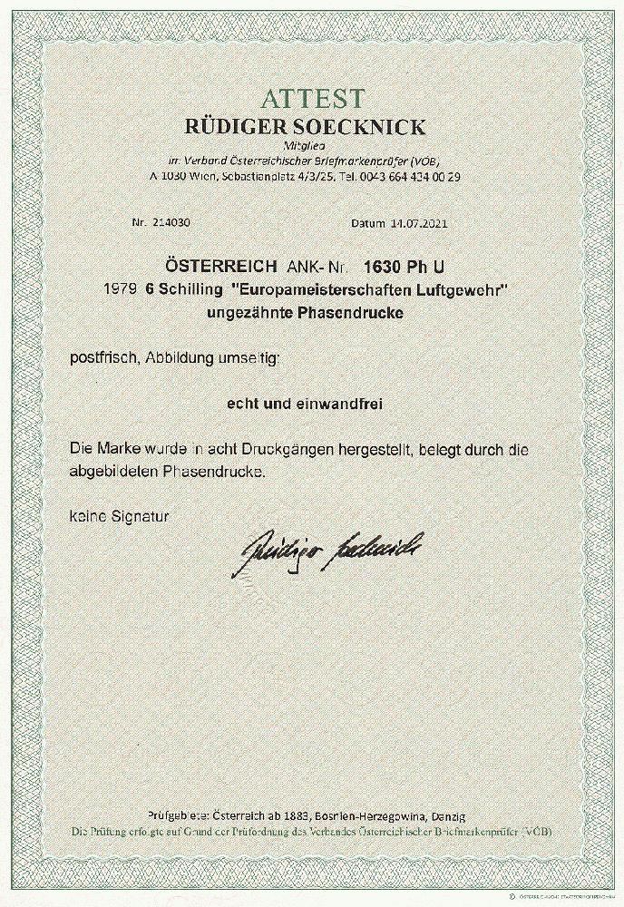 | Zusatzinformationen und Suchstichworte: | 11. Auktion Stilus Auktionstermin: 5. Juni 2022 Los 99 Österreich 2. Republik Österreich, 1979, ANK-Nr.: 1630 Ph U (Michel-Nr.: 1599), 'Europameisterschaften - Luftgewehr und Luftpistole', 6 Schilling, ungezähnte Phasendrucke (8), postfrisch **, einwandfreie Erhaltung, Attest Soecknick VÖB Ausruf 100,00 EUR |