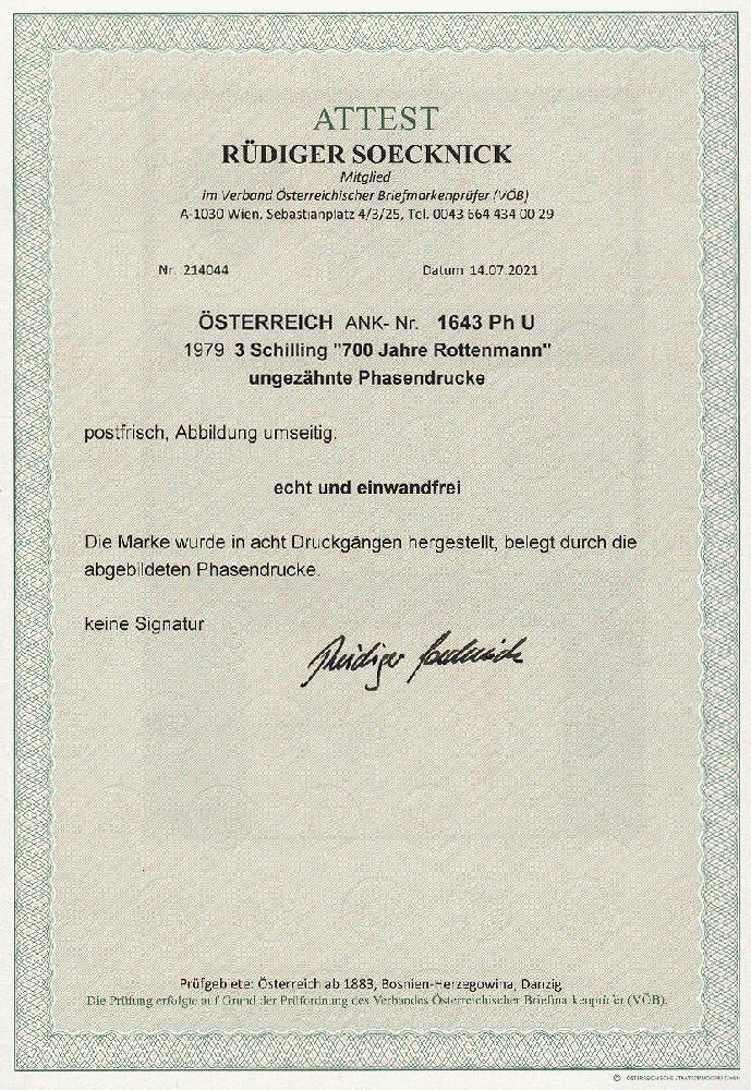 | Zusatzinformationen und Suchstichworte: | 11. Auktion Stilus Auktionstermin: 5. Juni 2022 Los 106 Österreich 2. Republik Österreich, 1979, ANK-Nr.: 1643 Ph U (Michel-Nr.: 1613), '700 Jahre Stadt Rottenmann', 3 Schilling, ungezähnte Phasendrucke (8), postfrisch **, einwandfreie Erhaltung, Attest Soecknick VÖB Zuschlag 100,00 EUR |