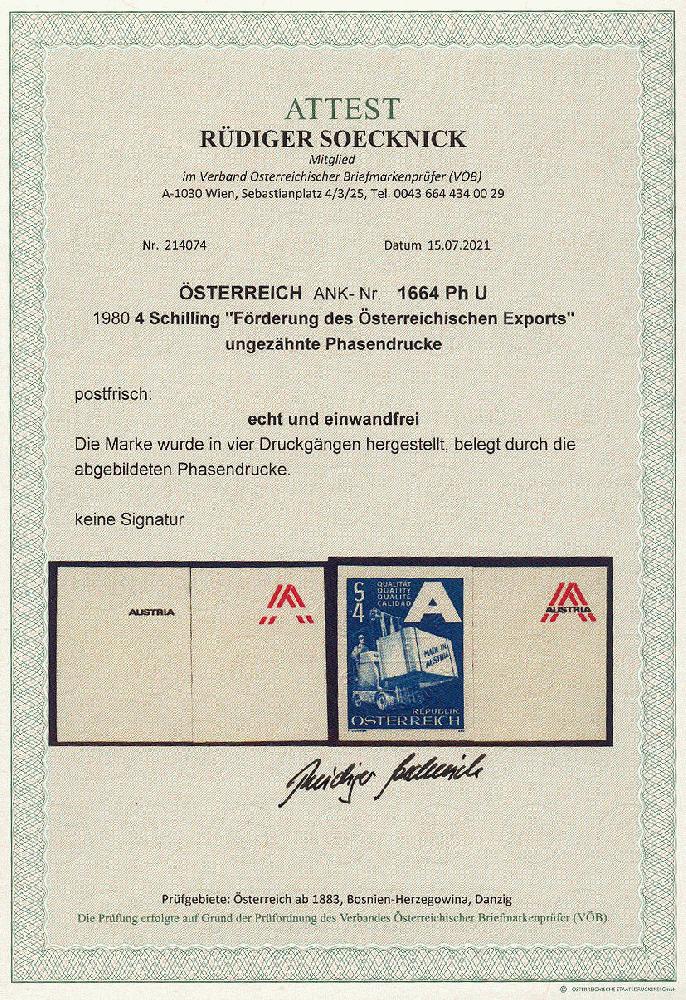 | Zusatzinformationen und Suchstichworte: | 11. Auktion Stilus Auktionstermin: 5. Juni 2022 Los 115 Österreich 2. Republik Österreich, 1980, ANK-Nr.: 1664 Ph U (Michel-Nr.: 1633), 'Förderung des Österreichischen Exports', 4 Schilling, ungezähnte Phasendrucke (4), postfrisch **, einwandfreie Erhaltung, Attest Soecknick VÖB |