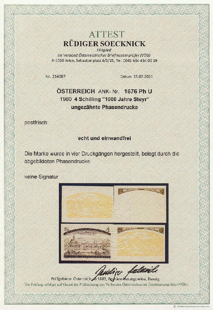 | Zusatzinformationen und Suchstichworte: | 11. Auktion Stilus Auktionstermin: 5. Juni 2022 Los 118 Österreich 2. Republik Österreich, 1980, ANK-Nr.: 1676 Ph U (Michel-Nr.: 1645), '1000 Jahre Steyr', 4 Schilling, ungezähnte Phasendrucke (4), postfrisch **, einwandfreie Erhaltung, Attest Soecknick VÖB Zuschlag 100,00 EUR |
