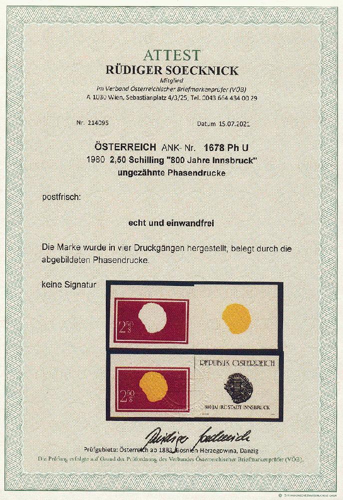 | Zusatzinformationen und Suchstichworte: | 11. Auktion Stilus Auktionstermin: 5. Juni 2022 Los 119 Österreich 2. Republik Österreich, 1980, ANK-Nr.: 1678 Ph U (Michel-Nr.: 1647), '800 Jahre Stadt Innsbruck', 2,5 Schilling, ungezähnte Phasendrucke (4), postfrisch **, einwandfreie Erhaltung, Attest Soecknick VÖB Ausruf 100,00 EUR |