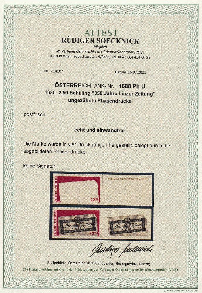 | Zusatzinformationen und Suchstichworte: | 11. Auktion Stilus Auktionstermin: 5. Juni 2022 Los 122 Österreich 2. Republik Österreich, 1980, ANK-Nr.: 1688 Ph U (Michel-Nr.: 1657), '350 Jahre Amtliche Linzer Zeitung', 2,5 Schilling, ungezähnte Phasendrucke (4), postfrisch **, einwandfreie Erhaltung, Attest Soecknick VÖB Ausruf 100,00 EUR |