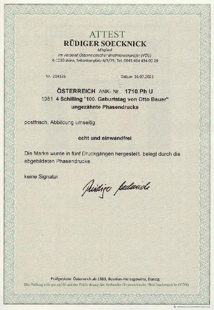 | Zusatzinformationen und Suchstichworte: | 11. Auktion Stilus Auktionstermin: 5. Juni 2022 Los 130 Österreich 2. Republik Österreich, 1981, ANK-Nr.: 1710 Ph U (Michel-Nr.: 1678), '100. Geburtstag von Otto Bauer', 4 Schilling, ungezähnte Phasendrucke (5), postfrisch **, einwandfreie Erhaltung, Attest Soecknick VÖB Ausruf 100,00 EUR |