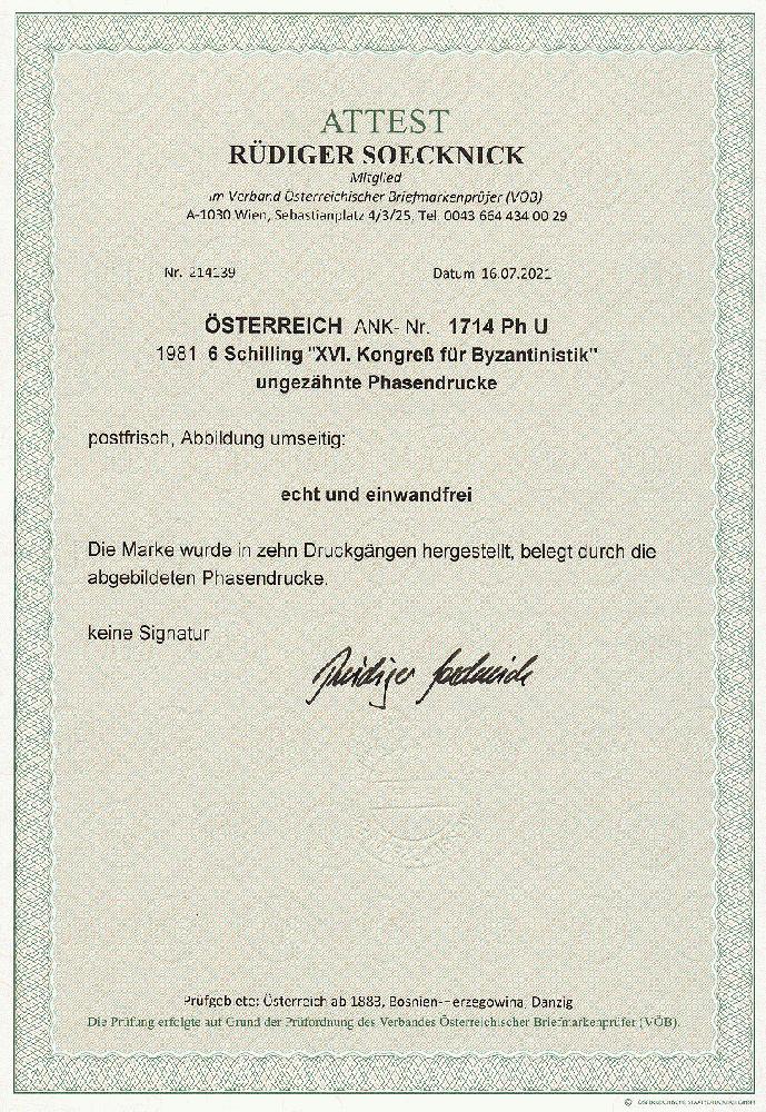| Zusatzinformationen und Suchstichworte: | 11. Auktion Stilus Auktionstermin: 5. Juni 2022 Los 132 Österreich 2. Republik Österreich, 1981, ANK-Nr.: 1714 Ph U (Michel-Nr.: 1683), 'XVI. Internationaler Kongress für Byzantinistik', 6 Schilling, ungezähnte Phasendrucke (10), postfrisch **, einwandfreie Erhaltung, Attest Soecknick VÖB Ausruf 100,00 EUR |