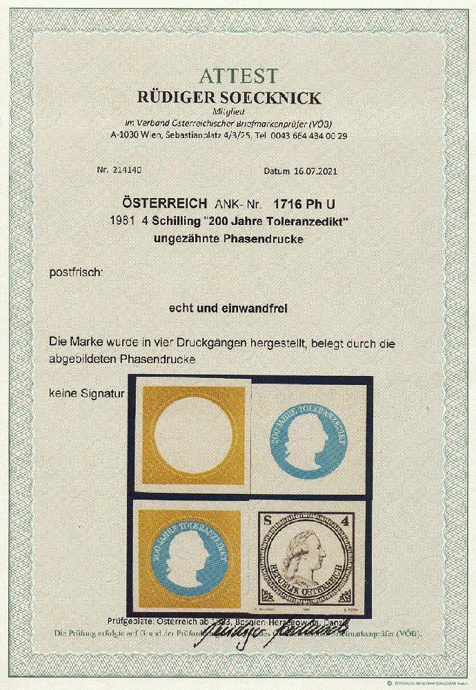 | Zusatzinformationen und Suchstichworte: | 11. Auktion Stilus Auktionstermin: 5. Juni 2022 Los 133 Österreich 2. Republik Österreich, 1981, ANK-Nr.: 1716 Ph U (Michel-Nr.: 1685), '200 Jahre Toleranzedikt', 4 Schilling, ungezähnte Phasendrucke (4), postfrisch **, einwandfreie Erhaltung, Attest Soecknick VÖB Ausruf 100,00 EUR |