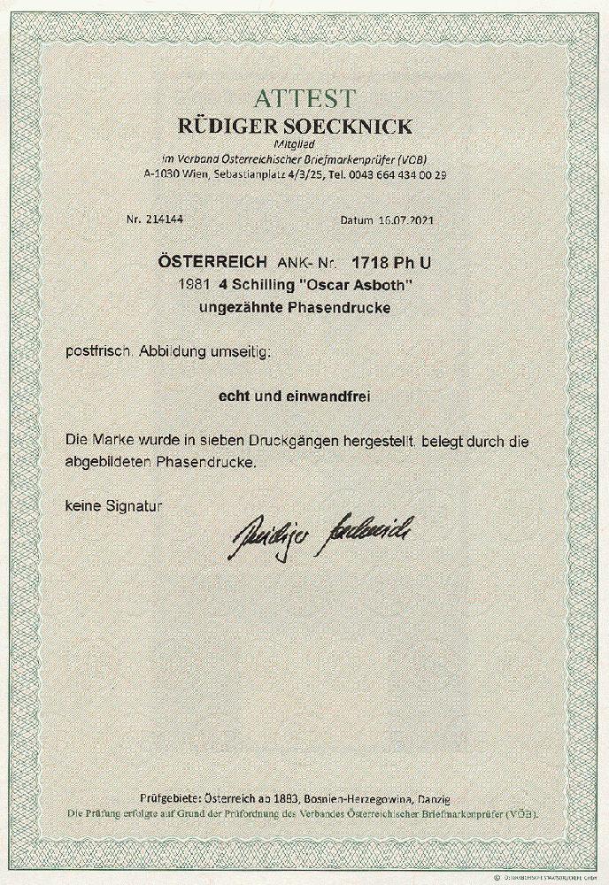 | Zusatzinformationen und Suchstichworte: | 11. Auktion Stilus Auktionstermin: 5. Juni 2022 Los 134 Österreich 2. Republik Österreich, 1981, ANK-Nr.: 1718 Ph U (Michel-Nr.: 1687), 'Moderne Kunst in Österreich', 4 Schilling, ungezähnte Phasendrucke (7), postfrisch **, einwandfreie Erhaltung, Attest Soecknick VÖB Ausruf 100,00 EUR |