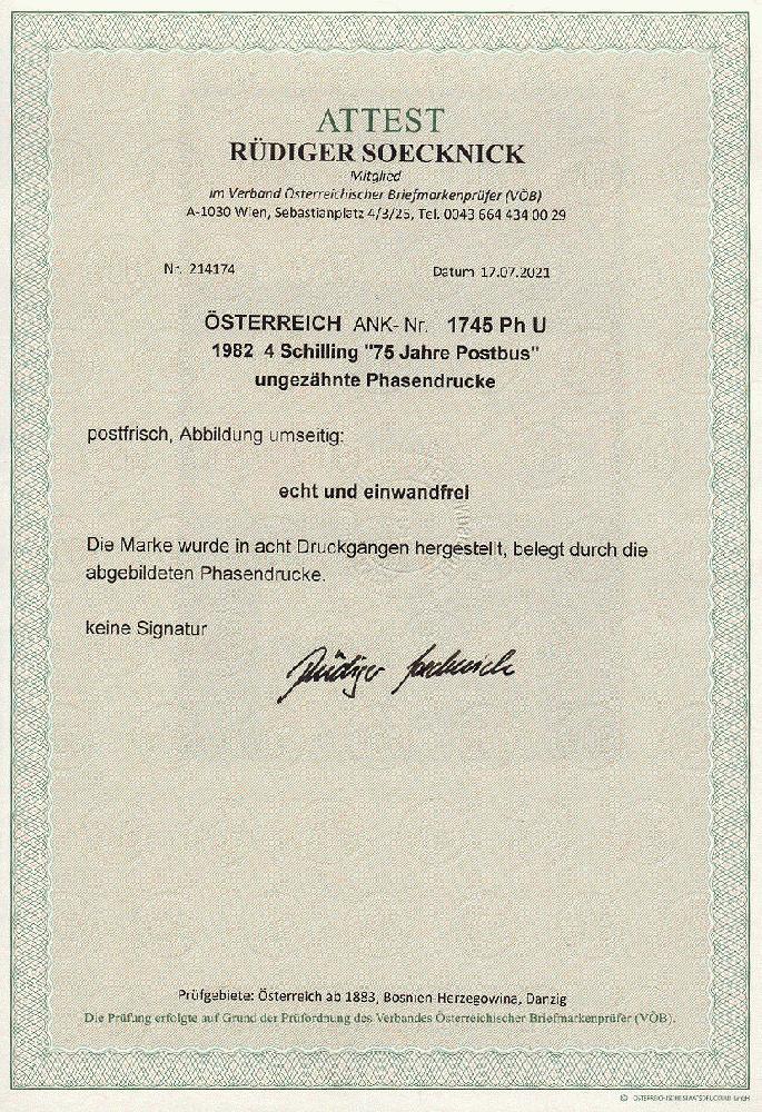 | Zusatzinformationen und Suchstichworte: | 11. Auktion Stilus Auktionstermin: 5. Juni 2022 Los 145 Österreich 2. Republik Österreich, 1982, ANK-Nr.: 1745 Ph U (Michel-Nr.: 1714), '75 Jahre Postbusverkehr', 4 Schilling, ungezähnte Phasendrucke (8), postfrisch **, einwandfreie Erhaltung, Attest Soecknick VÖB Zuschlag 100,00 EUR |