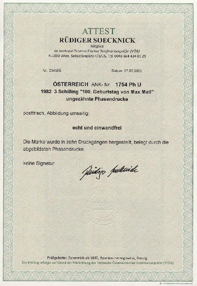 | Zusatzinformationen und Suchstichworte: | 11. Auktion Stilus Auktionstermin: 5. Juni 2022 Los 148 Österreich 2. Republik Österreich, 1982, ANK-Nr.: 1754 Ph U (Michel-Nr.: 1723), '100. Geburtstag von Max Mell', 3 Schilling, ungezähnte Phasendrucke (10), postfrisch **, einwandfreie Erhaltung, Attest Soecknick VÖB Zuschlag 100,00 EUR |