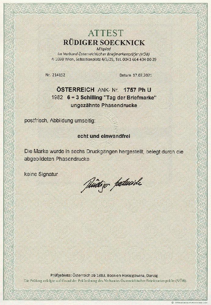 | Zusatzinformationen und Suchstichworte: | 11. Auktion Stilus Auktionstermin: 5. Juni 2022 Los 149 Österreich 2. Republik Österreich, 1982, ANK-Nr.: 1757 Ph U (Michel-Nr.: 1726), 'Tag der Briefmarke 1982', 6 + 3 Schilling, ungezähnte Phasendrucke (6), postfrisch **, einwandfreie Erhaltung, Attest Soecknick VÖB Ausruf 100,00 EUR |