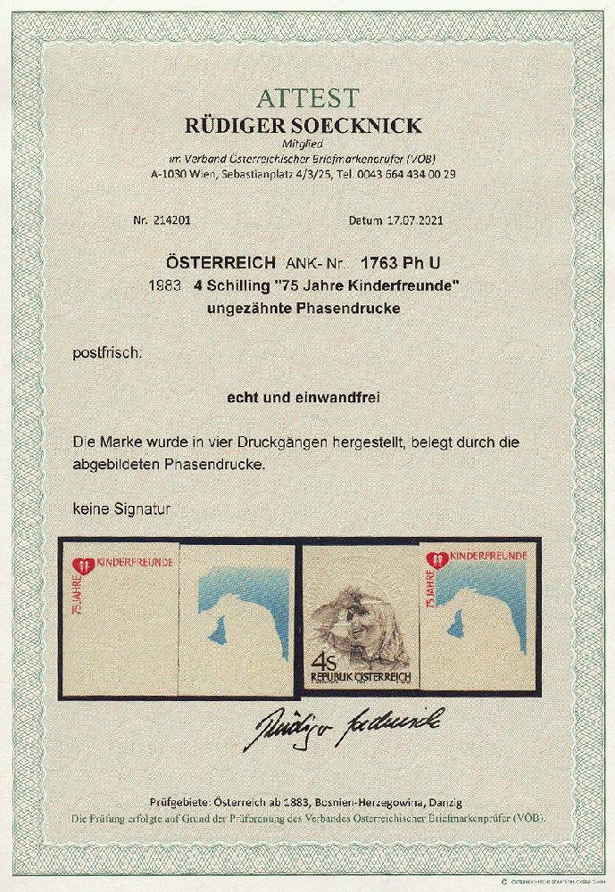 | Zusatzinformationen und Suchstichworte: | 11. Auktion Stilus Auktionstermin: 5. Juni 2022 Los 153 Österreich 2. Republik Österreich, 1983, ANK-Nr.: 1763 Ph U (Michel-Nr.: 1732), '75 Jahre Kinderfreunde', 4 Schilling, ungezähnte Phasendrucke (4), postfrisch **, einwandfreie Erhaltung, Attest Soecknick VÖB Ausruf 100,00 EUR |