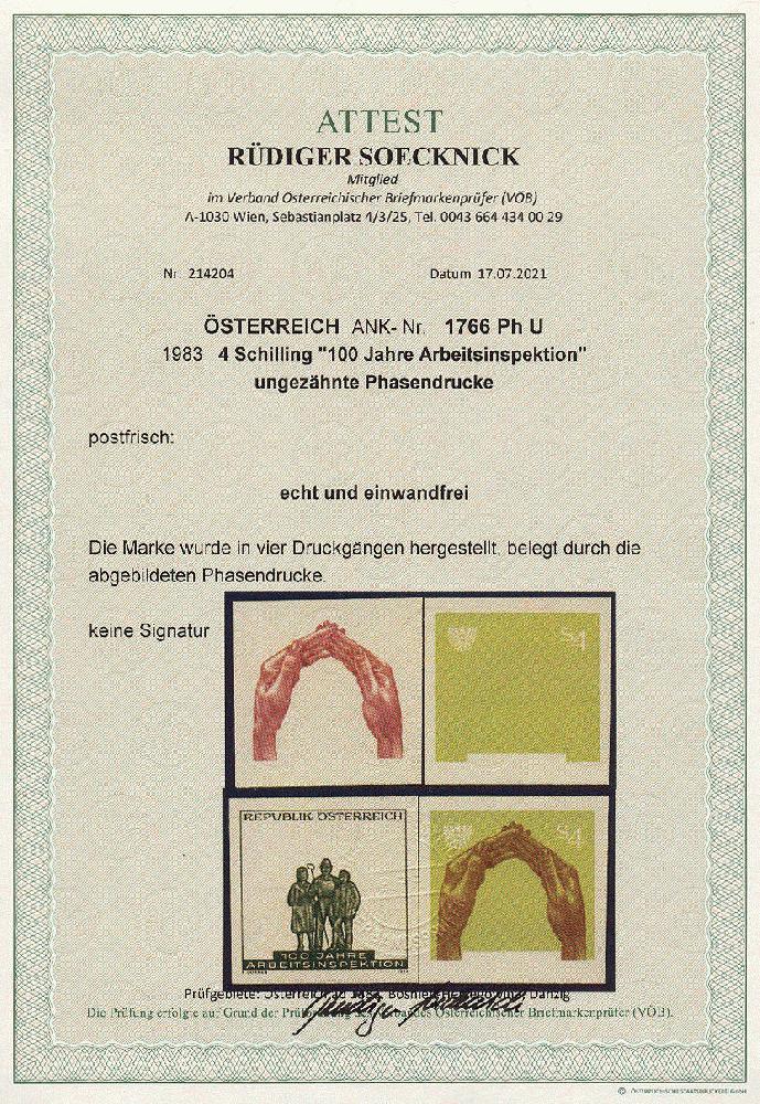 | Zusatzinformationen und Suchstichworte: | 11. Auktion Stilus Auktionstermin: 5. Juni 2022 Los 154 Österreich 2. Republik Österreich, 1983, ANK-Nr.: 1766 Ph U (Michel-Nr.: 1735), '100 Jahre Arbeitsinspektion', 4 Schilling, ungezähnte Phasendrucke (4), postfrisch **, einwandfreie Erhaltung, Attest Soecknick VÖB Ausruf 100,00 EUR |