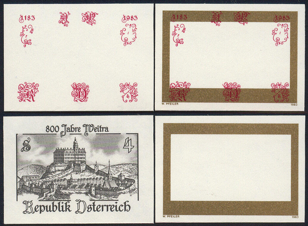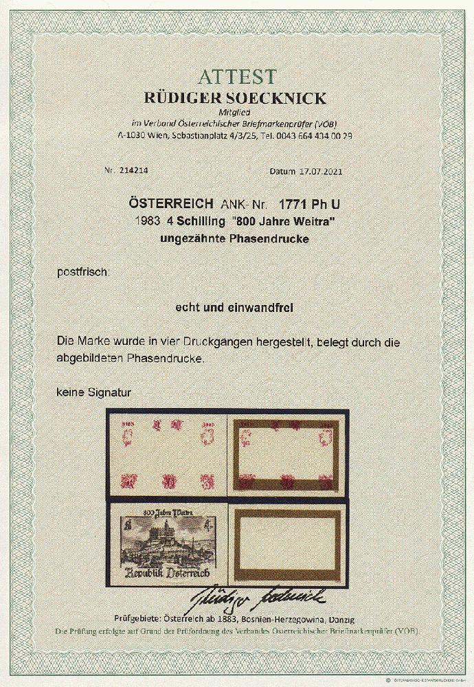| Zusatzinformationen und Suchstichworte: | 11. Auktion Stilus Auktionstermin: 5. Juni 2022 Los 158 Österreich 2. Republik Österreich, 1983, ANK-Nr.: 1771 Ph U (Michel-Nr.: 1740), '800 Jahre Weitra', 4 Schilling, ungezähnte Phasendrucke (4), postfrisch **, einwandfreie Erhaltung, Attest Soecknick VÖB Ausruf 100,00 EUR |
