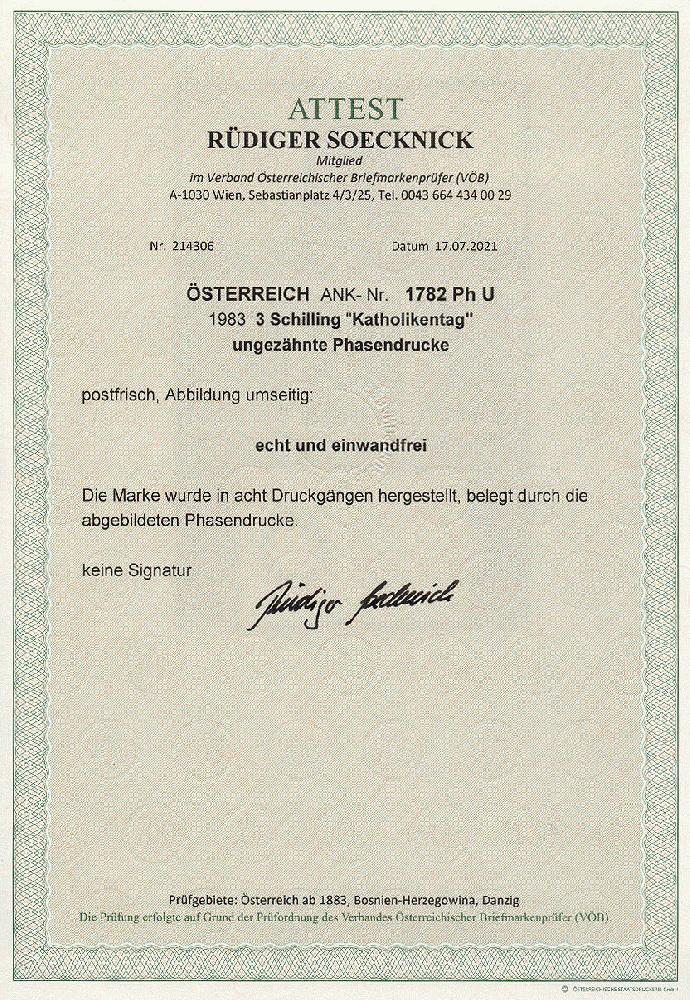 | Zusatzinformationen und Suchstichworte: | 11. Auktion Stilus Auktionstermin: 5. Juni 2022 Los 161 Österreich 2. Republik Österreich, 1983, ANK-Nr.: 1782 Ph U (Michel-Nr.: 1751), 'Österreichischer Katholikentag', 3 Schilling, ungezähnte Phasendrucke (8), postfrisch **, einwandfreie Erhaltung, Attest Soecknick VÖB Zuschlag 100,00 EUR |