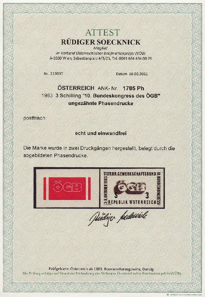 | Zusatzinformationen und Suchstichworte: | 11. Auktion Stilus Auktionstermin: 5. Juni 2022 Los 163 Österreich 2. Republik Österreich, 1983, ANK-Nr.: 1785 Ph U (Michel-Nr.: 1754), '10. Bundeskongress des ÖGB', 3 Schilling, ungezähnte Phasendrucke (2), postfrisch **, einwandfreie Erhaltung, Attest Soecknick VÖB Ausruf 100,00 EUR |