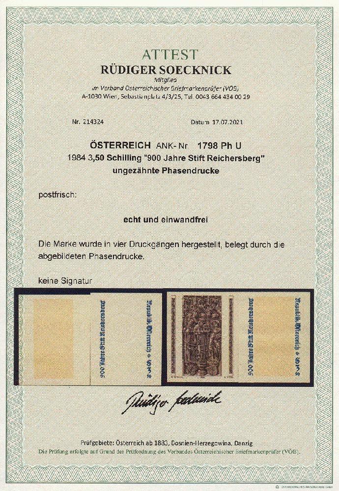 | Zusatzinformationen und Suchstichworte: | 11. Auktion Stilus Auktionstermin: 5. Juni 2022 Los 171 Österreich 2. Republik Österreich, 1984, ANK-Nr.: 1798 Ph U (Michel-Nr.: 1767), '900 Jahre Stift Reichersberg', 3,5 Schilling, ungezähnte Phasendrucke (4), postfrisch **, einwandfreie Erhaltung, Attest Soecknick VÖB Zuschlag 100,00 EUR |