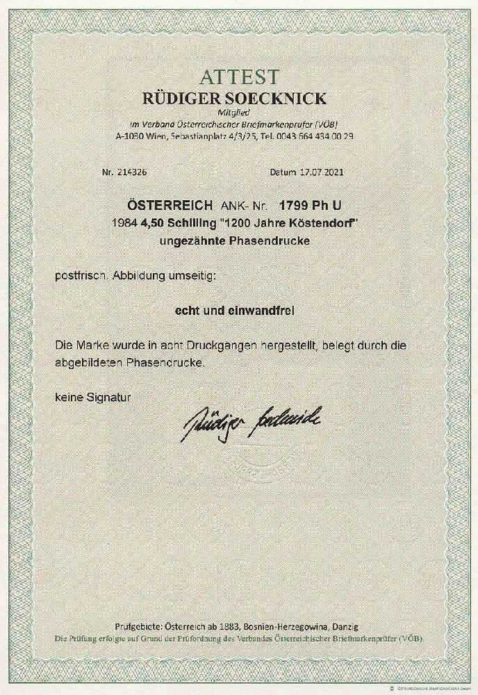 | Zusatzinformationen und Suchstichworte: | 11. Auktion Stilus Auktionstermin: 5. Juni 2022 Los 173 Österreich 2. Republik Österreich, 1984, ANK-Nr.: 1799 Ph U (Michel-Nr.: 1771), '1200 Jahre Köstendorf', 4,5 Schilling, ungezähnte Phasendrucke (8), postfrisch **, einwandfreie Erhaltung, Attest Soecknick VÖB Ausruf 100,00 EUR |