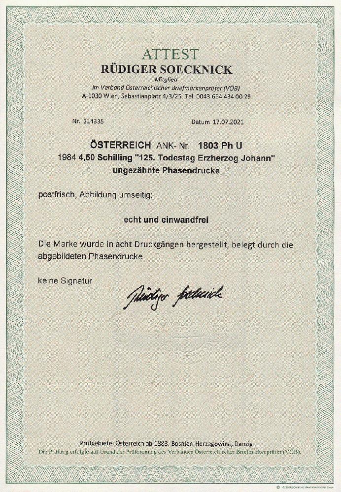 | Zusatzinformationen und Suchstichworte: | 11. Auktion Stilus Auktionstermin: 5. Juni 2022 Los 175 Österreich 2. Republik Österreich, 1984, ANK-Nr.: 1803 Ph U (Michel-Nr.: 1774), '125. Todestag von Erzherzog Johann', 4,5 Schilling, ungezähnte Phasendrucke (8), postfrisch **, einwandfreie Erhaltung, Attest Soecknick VÖB Zuschlag 130,00 EUR |