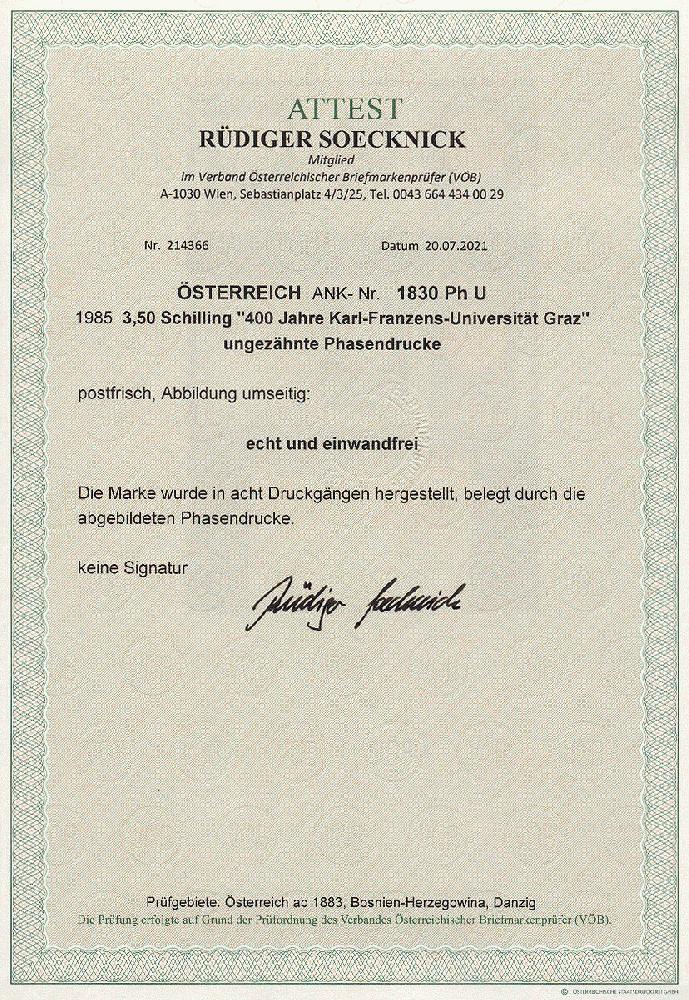 | Zusatzinformationen und Suchstichworte: | 11. Auktion Stilus Auktionstermin: 5. Juni 2022 Los 187 Österreich 2. Republik Österreich, 1985, ANK-Nr.: 1830 Ph U (Michel-Nr.: 1799), '400 Jahre Karl-Franzens-Universität, Graz', 3,5 Schilling, ungezähnte Phasendrucke (8), postfrisch **, einwandfreie Erhaltung, Attest Soecknick VÖB Zuschlag 130,00 EUR |