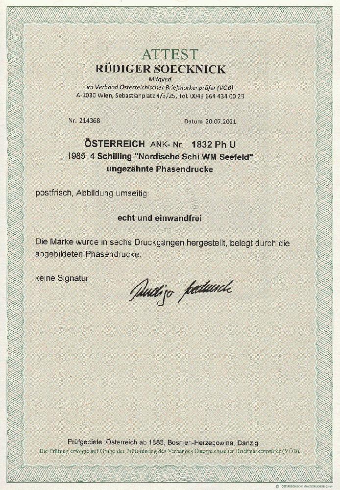 | Zusatzinformationen und Suchstichworte: | 11. Auktion Stilus Auktionstermin: 5. Juni 2022 Los 188 Österreich 2. Republik Österreich, 1985, ANK-Nr.: 1832 Ph U (Michel-Nr.: 1801), 'Nordische Skiweltmeisterschaften - Seefeld', 4 Schilling, ungezähnte Phasendrucke (6), postfrisch **, einwandfreie Erhaltung, Attest Soecknick VÖB Zuschlag 100,00 EUR |