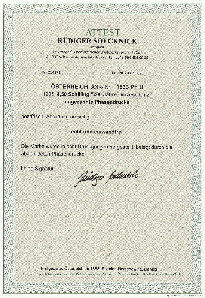 | Zusatzinformationen und Suchstichworte: | 11. Auktion Stilus Auktionstermin: 5. Juni 2022 Los 189 Österreich 2. Republik Österreich, 1985, ANK-Nr.: 1833 Ph U (Michel-Nr.: 1802), '200 Jahre Diözese Linz', 4,5 Schilling, ungezähnte Phasendrucke (8), postfrisch **, einwandfreie Erhaltung, Attest Soecknick VÖB Ausruf 100,00 EUR |