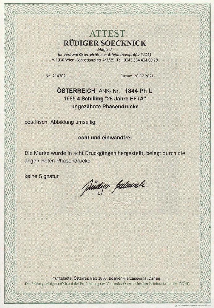 | Zusatzinformationen und Suchstichworte: | 11. Auktion Stilus Auktionstermin: 5. Juni 2022 Los 196 Österreich 2. Republik Österreich, 1985, ANK-Nr.: 1844 Ph U (Michel-Nr.: 1813), '25 Jahre EFTA', 4 Schilling, ungezähnte Phasendrucke (8), postfrisch **, einwandfreie Erhaltung, Attest Soecknick VÖB Ausruf 100,00 EUR |