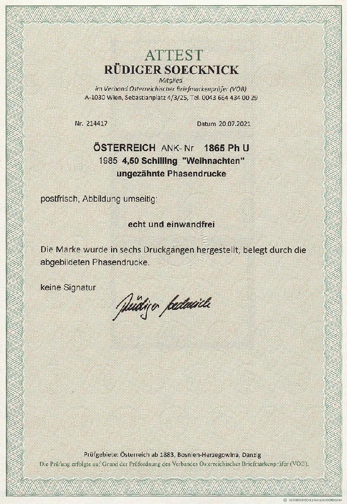 | Zusatzinformationen und Suchstichworte: | 11. Auktion Stilus Auktionstermin: 5. Juni 2022 Los 204 Österreich 2. Republik Österreich, 1985, ANK-Nr.: 1865 Ph U (Michel-Nr.: 1832), 'Weihnachten 1985', 4,5 Schilling, ungezähnte Phasendrucke (6), postfrisch **, einwandfreie Erhaltung, Attest Soecknick VÖB Ausruf 100,00 EUR |