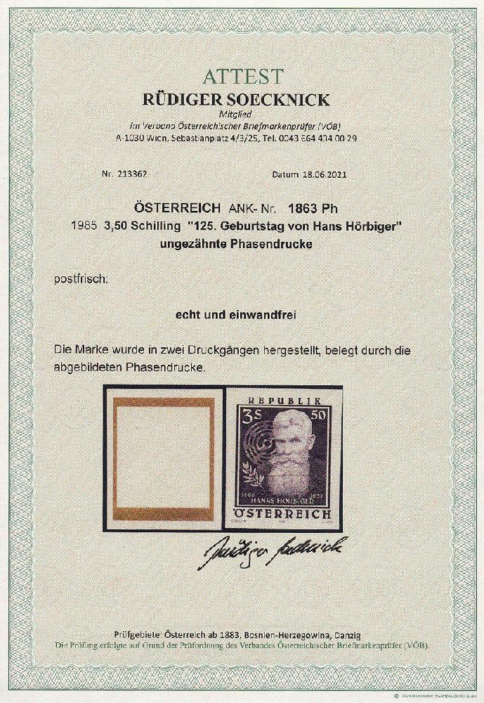 | Zusatzinformationen und Suchstichworte: | 11. Auktion Stilus Auktionstermin: 5. Juni 2022 Los 205 Österreich 2. Republik Österreich, 1985, ANK-Nr.: 1863 Ph U (Michel-Nr.: 1833), '125. Geburtstag von Hanns Hörbiger', 3,5 Schilling, ungezähnte Phasendrucke (2), postfrisch **, einwandfreie Erhaltung, Attest Soecknick VÖB Ausruf 100,00 EUR |