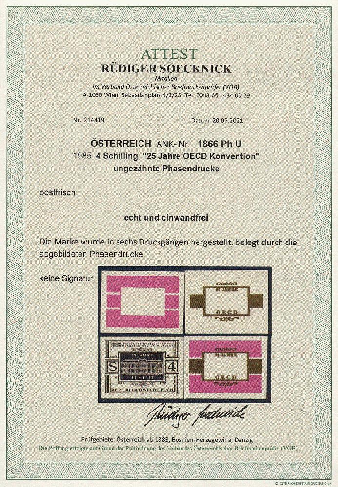 | Zusatzinformationen und Suchstichworte: | 11. Auktion Stilus Auktionstermin: 5. Juni 2022 Los 207 Österreich 2. Republik Österreich, 1985, ANK-Nr.: 1866 Ph U (Michel-Nr.: 1835), '25 Jahre OECD-Konvention', 4 Schilling, ungezähnte Phasendrucke (4), postfrisch **, einwandfreie Erhaltung, Attest Soecknick VÖB Ausruf 100,00 EUR |