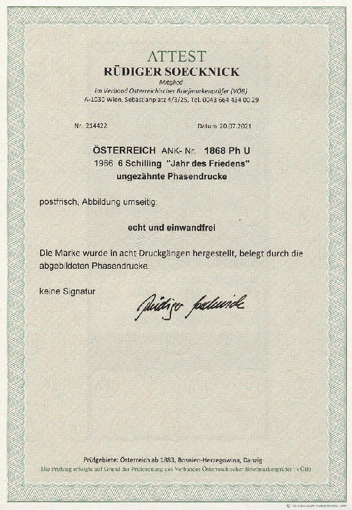 | Zusatzinformationen und Suchstichworte: | 11. Auktion Stilus Auktionstermin: 5. Juni 2022 Los 209 Österreich 2. Republik Österreich, 1986, ANK-Nr.: 1868 Ph U (Michel-Nr.: 1837), 'Jahr des Friedens', 6 Schilling, ungezähnte Phasendrucke (8), postfrisch **, einwandfreie Erhaltung, Attest Soecknick VÖB Ausruf 100,00 EUR |