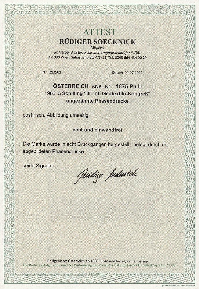 | Zusatzinformationen und Suchstichworte: | 11. Auktion Stilus Auktionstermin: 5. Juni 2022 Los 212 Österreich 2. Republik Österreich, 1986, ANK-Nr.: 1875 Ph U (Michel-Nr.: 1844), 'III. Int. Geotextil-Kongress', 5 Schilling, ungezähnte Phasendrucke (8), postfrisch **, einwandfreie Erhaltung, Attest Soecknick VÖB Ausruf 100,00 EUR |