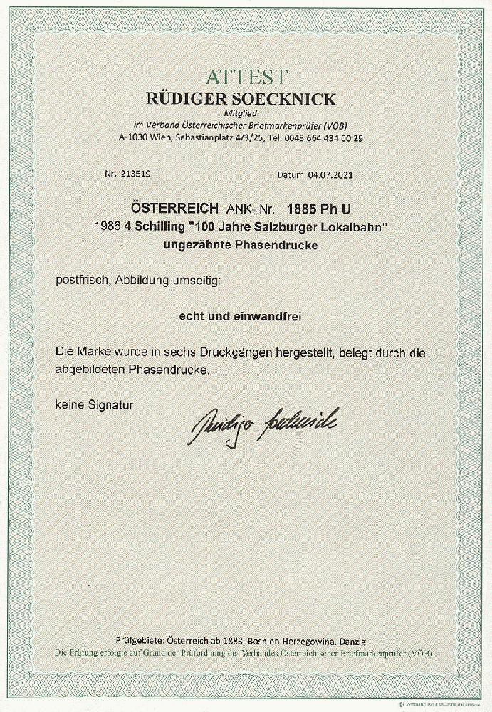 | Zusatzinformationen und Suchstichworte: | 11. Auktion Stilus Auktionstermin: 5. Juni 2022 Los 220 Österreich 2. Republik Österreich, 1986, ANK-Nr.: 1885 Ph U (Michel-Nr.: 1854), '100-Jahr-Jubiläum der Salzburger Lokalbahn', 4 Schilling, ungezähnte Phasendrucke (8), postfrisch **, einwandfreie Erhaltung, Attest Soecknick VÖB Zuschlag 100,00 EUR |
