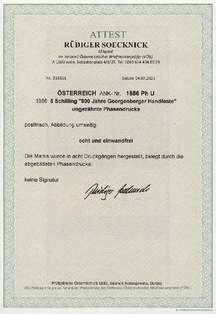 | Zusatzinformationen und Suchstichworte: | 11. Auktion Stilus Auktionstermin: 5. Juni 2022 Los 221 Österreich 2. Republik Österreich, 1986, ANK-Nr.: 1886 Ph U (Michel-Nr.: 1855), '800-Jahr-Jubiläum der Georgensberger Handfeste', 5 Schilling, ungezähnte Phasendrucke (8), postfrisch **, einwandfreie Erhaltung, Attest Soecknick VÖB Ausruf 100,00 EUR |