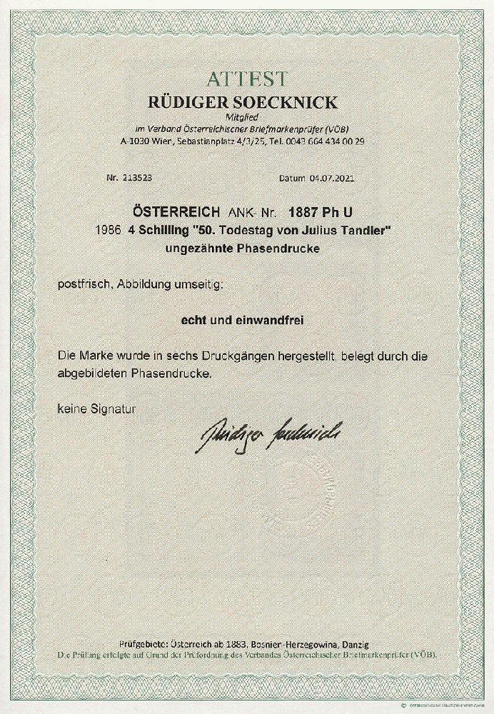 | Zusatzinformationen und Suchstichworte: | 11. Auktion Stilus Auktionstermin: 5. Juni 2022 Los 222 Österreich 2. Republik Österreich, 1986, ANK-Nr.: 1887 Ph U (Michel-Nr.: 1856), '50. Todestag von Julius Tandler', 4 Schilling, ungezähnte Phasendrucke (6), postfrisch **, einwandfreie Erhaltung, Attest Soecknick VÖB Ausruf 100,00 EUR |