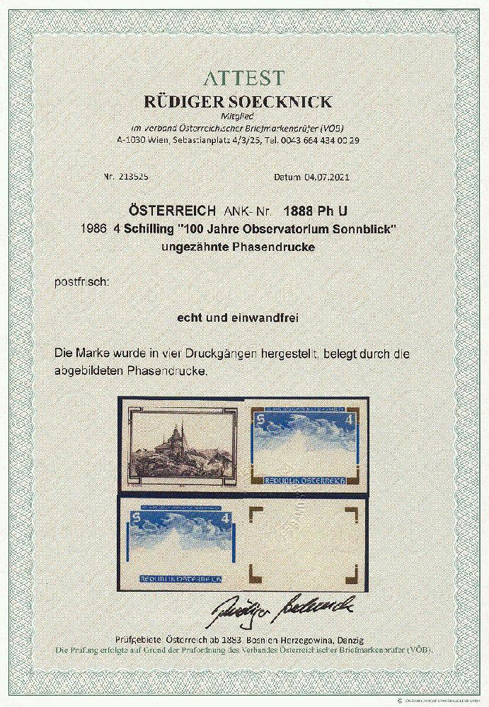 | Zusatzinformationen und Suchstichworte: | 11. Auktion Stilus Auktionstermin: 5. Juni 2022 Los 223 Österreich 2. Republik Österreich, 1986, ANK-Nr.: 1888 Ph U (Michel-Nr.: 1857), '100 Jahre Observatorium auf dem Sonnblick', 4 Schilling, ungezähnte Phasendrucke (4), postfrisch **, einwandfreie Erhaltung, Attest Soecknick VÖB Ausruf 100,00 EUR |