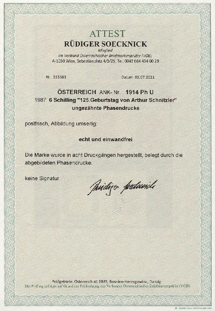 | Zusatzinformationen und Suchstichworte: | 11. Auktion Stilus Auktionstermin: 5. Juni 2022 Los 233 Österreich 2. Republik Österreich, 1987, ANK-Nr.: 1914 Ph U (Michel-Nr.: 1883), '125. Geb. von Arthur Schnitzler', 6 Schilling, ungezähnte Phasendrucke (8), postfrisch **, einwandfreie Erhaltung, Attest Soecknick VÖB Ausruf 100,00 EUR |