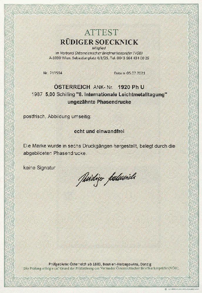 | Zusatzinformationen und Suchstichworte: | 11. Auktion Stilus Auktionstermin: 5. Juni 2022 Los 238 Österreich 2. Republik Österreich, 1987, ANK-Nr.: 1920 Ph U (Michel-Nr.: 1889), '8. Internationale Leichtmetalltagung, Leoben - Wien', 5 Schilling, ungezähnte Phasendrucke (6), postfrisch **, einwandfreie Erhaltung, Attest Soecknick VÖB Ausruf 100,00 EUR |