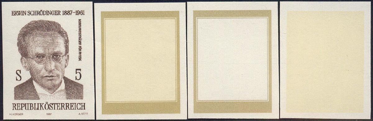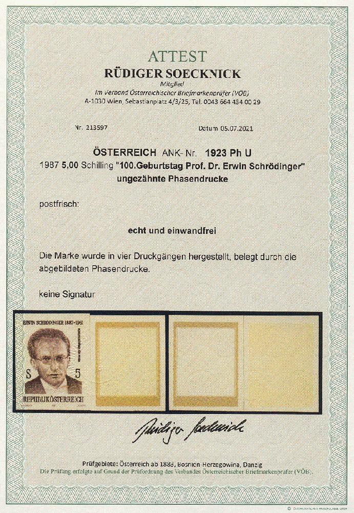 | Zusatzinformationen und Suchstichworte: | 11. Auktion Stilus Auktionstermin: 5. Juni 2022 Los 239 Österreich 2. Republik Österreich, 1987, ANK-Nr.: 1923 Ph U (Michel-Nr.: 1892), '100. Geb. von Prof. Dr. Erwin Schrödinger', 5 Schilling, ungezähnte Phasendrucke (4), postfrisch **, einwandfreie Erhaltung, Attest Soecknick VÖB Ausruf 100,00 EUR |
