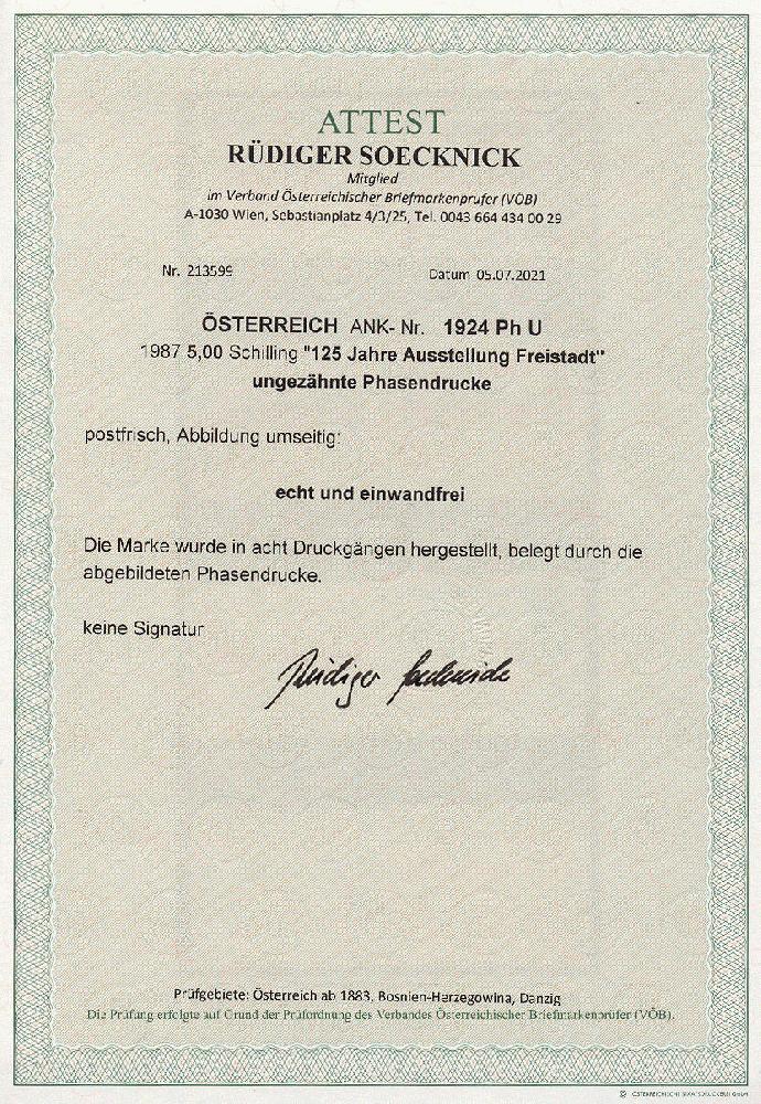 | Zusatzinformationen und Suchstichworte: | 11. Auktion Stilus Auktionstermin: 5. Juni 2022 Los 240 Österreich 2. Republik Österreich, 1987, ANK-Nr.: 1924 Ph U (Michel-Nr.: 1893), '125 Jahre Ausstellung in Freistadt', 5 Schilling, ungezähnte Phasendrucke (8), postfrisch **, einwandfreie Erhaltung, Attest Soecknick VÖB Ausruf 100,00 EUR |