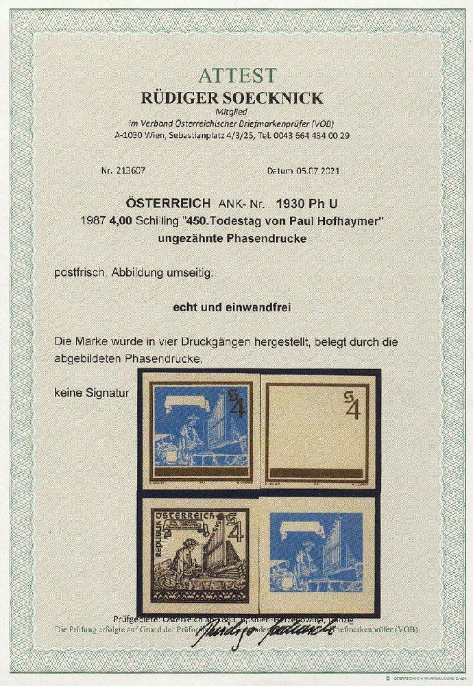 | Zusatzinformationen und Suchstichworte: | 11. Auktion Stilus Auktionstermin: 5. Juni 2022 Los 243 Österreich 2. Republik Österreich, 1987, ANK-Nr.: 1930 Ph U (Michel-Nr.: 1899), '450. Todestag von Paul Hofhaymer', 4 Schilling, ungezähnte Phasendrucke (4), postfrisch **, einwandfreie Erhaltung, Attest Soecknick VÖB Ausruf 100,00 EUR |