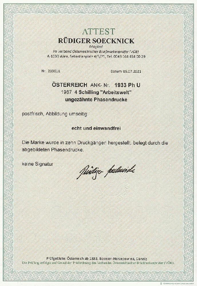 | Zusatzinformationen und Suchstichworte: | 11. Auktion Stilus Auktionstermin: 5. Juni 2022 Los 244 Österreich 2. Republik Österreich, 1987, ANK-Nr.: 1933 Ph U (Michel-Nr.: 1902), 'Die österreichische Arbeitswelt', 4 Schilling, ungezähnte Phasendrucke (10), postfrisch **, einwandfreie Erhaltung, Attest Soecknick VÖB Zuschlag 100,00 EUR |