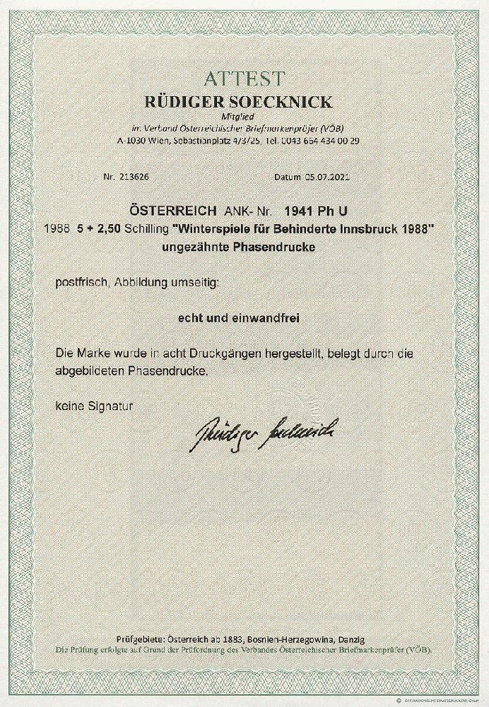 | Zusatzinformationen und Suchstichworte: | 11. Auktion Stilus Auktionstermin: 5. Juni 2022 Los 250 Österreich 2. Republik Österreich, 1988, ANK-Nr.: 1941 Ph U (Michel-Nr.: 1910), 'Winterspiele für Behinderte - Innsbruck 1988', 5 + 2,5 Schilling, ungezähnte Phasendrucke (8), postfrisch **, einwandfreie Erhaltung, Attest Soecknick VÖB Ausruf 100,00 EUR |