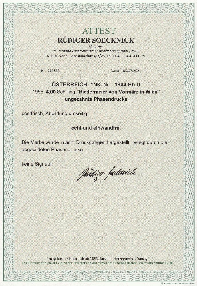 | Zusatzinformationen und Suchstichworte: | 11. Auktion Stilus Auktionstermin: 5. Juni 2022 Los 252 Österreich 2. Republik Österreich, 1988, ANK-Nr.: 1944 Ph U (Michel-Nr.: 1913), 'Ausstellung Bürgersinn und Aufbegehren - Biedermeier und Vormärz in Wien', 4 Schilling, ungezähnte Phasendrucke (8), postfrisch **, einwandfreie Erhaltung, Attest Soecknick VÖB Ausruf 100,00 EUR |