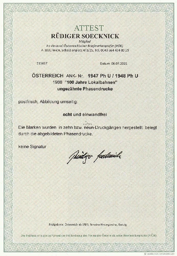 | Zusatzinformationen und Suchstichworte: | 11. Auktion Stilus Auktionstermin: 5. Juni 2022 Los 253 Österreich 2. Republik Österreich, 1988, ANK-Nr.: 1947 - 1948 Ph U (Michel-Nr.: 1916 - 1917), '100 Jahre Lokalbahnen', 4 - 5 Schilling, ungezähnte Phasendrucke (17), postfrisch **, einwandfreie Erhaltung, Attest Soecknick VÖB Ausruf 200,00 EUR |