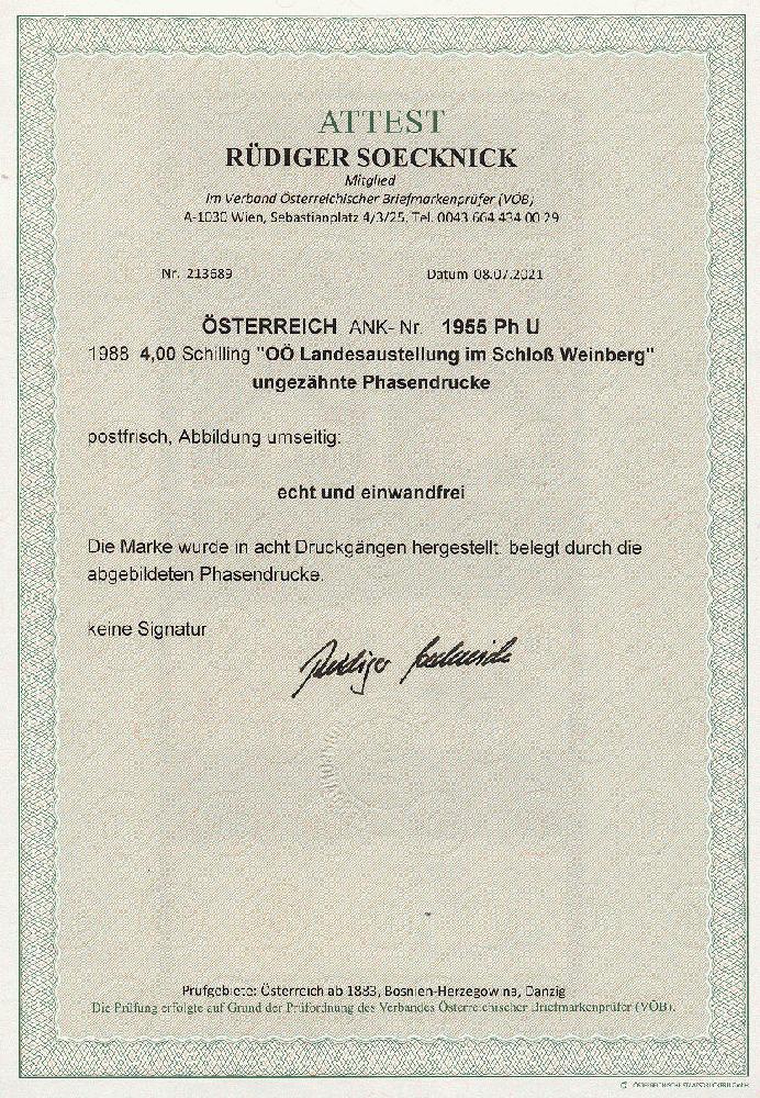 | Zusatzinformationen und Suchstichworte: | 11. Auktion Stilus Auktionstermin: 5. Juni 2022 Los 258 Österreich 2. Republik Österreich, 1988, ANK-Nr.: 1955 Ph U (Michel-Nr.: 1924), 'OÖ-Landesausstellung im Schloss Weinberg bei Kefermarkt', 4 Schilling, ungezähnte Phasendrucke (8), postfrisch **, einwandfreie Erhaltung, Attest Soecknick VÖB Ausruf 100,00 EUR |